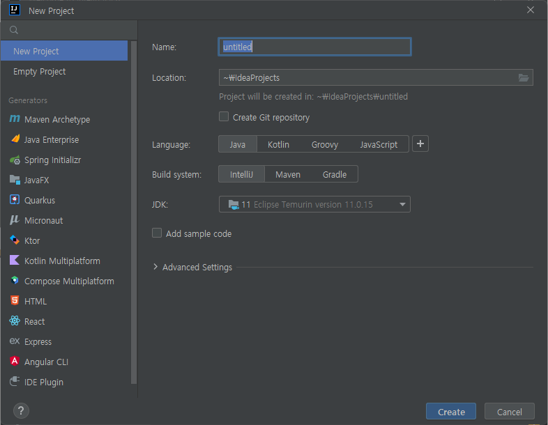 일단 New Project를 눌러 아무렇게나 생성해주자.