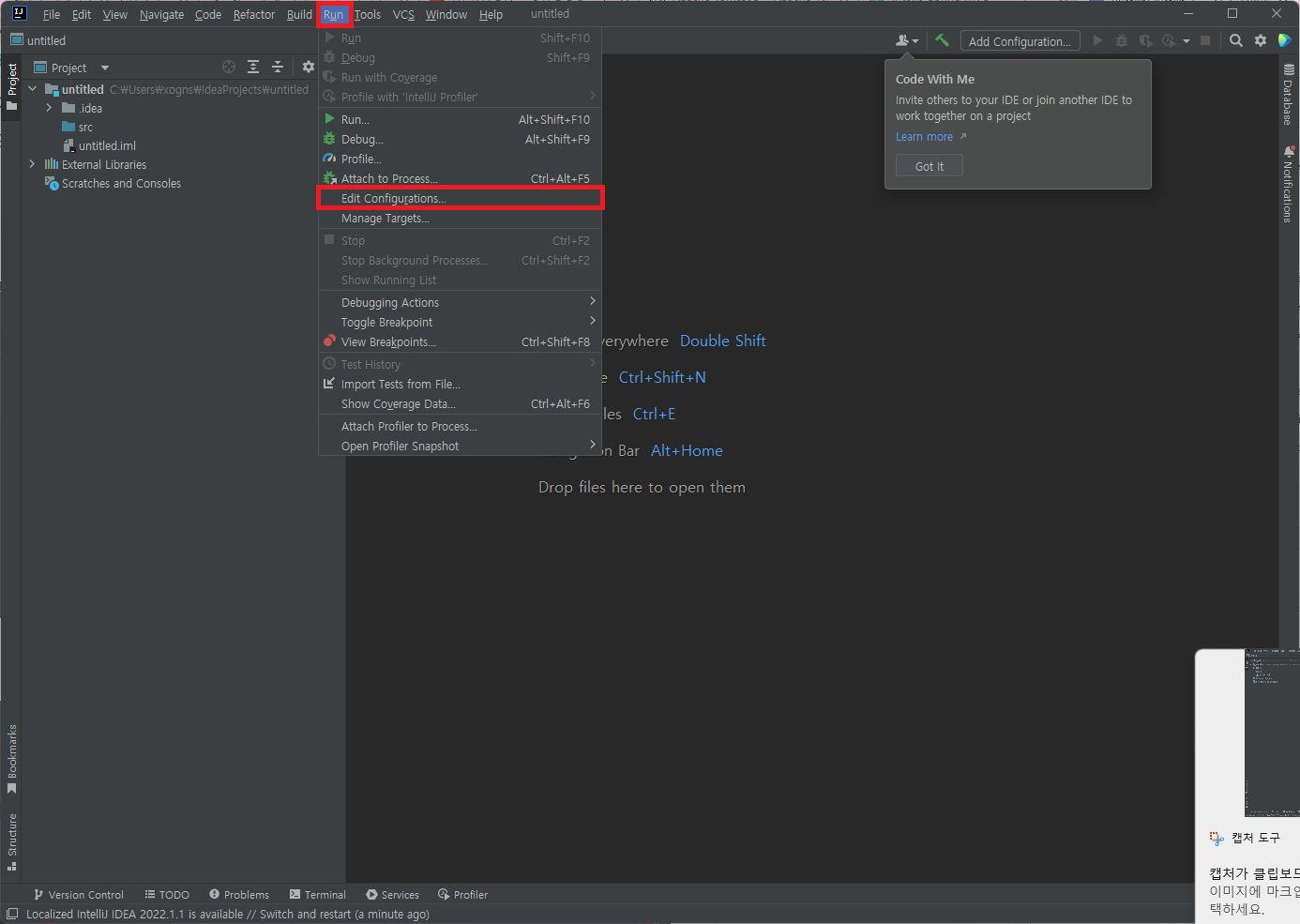 Run > Edit Configurations에 들어가주자.