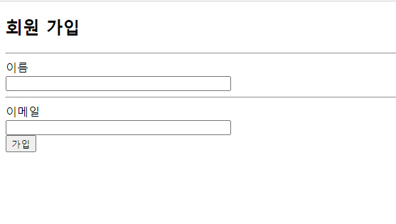 html파일을 새로고침한뒤 이름과 이메일에 아무값을 넣어보고 가입버튼을 눌러보자