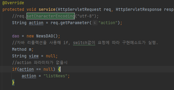 ch10의 NewsController 서블릿에서 service()의 request.setCharacterEncoding()을 주석처리해주자.