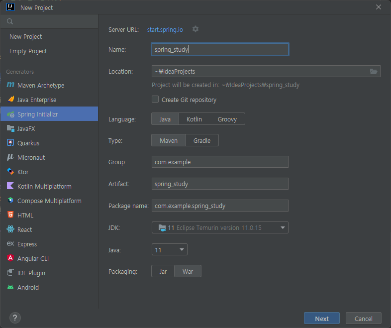 - Name: 프로젝트 이름. spring_study로 만들어주자.